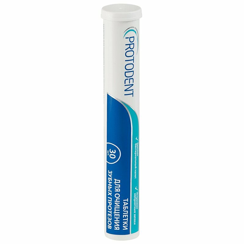 Protodent таблетки для очищения зубных протезов содержат ряд активных компонентов, которые очищают и дезинфицируют зубной протез. Не повреждая протез механически, они идеально очищают его даже в самых труднодоступных местах, уничтожают болезнетворные микроорганизмы и неприятные запахи, удаляют налет и зубной камень, восстанавливают естественный цвет протезов и позволяют избежать инфекций в полости рта. Растворите 1 таблетку в половине стакана теплой воды, поместите в него предварительно очищенный протез на 10 минут и затем тщательно промойте протез водой.