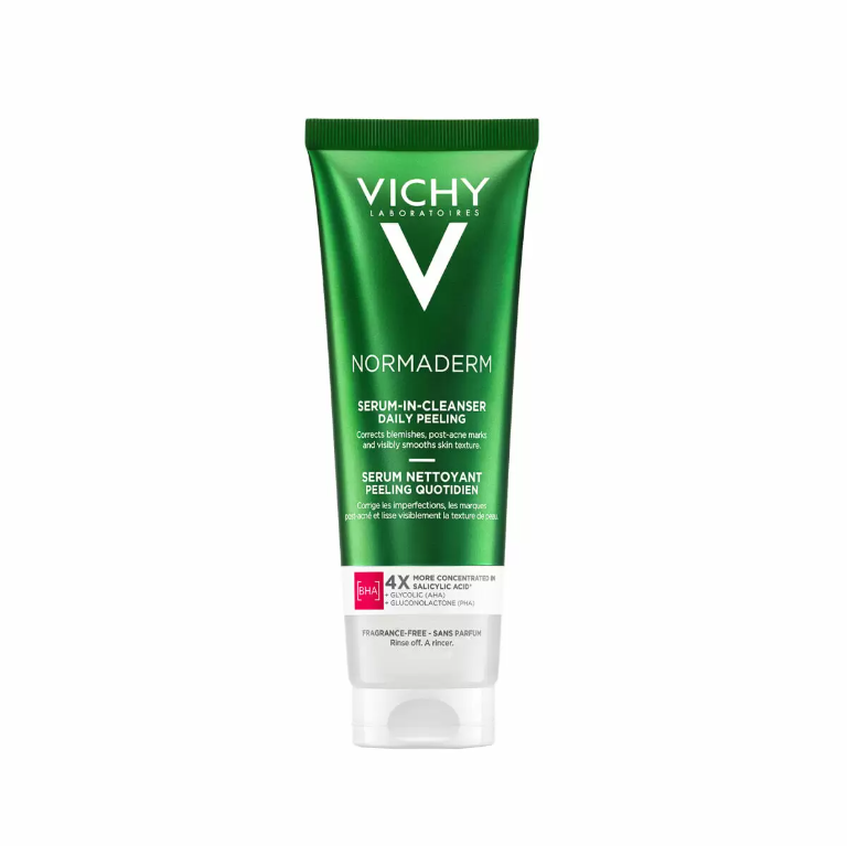 Vichy представляет инновацию: новый гель-сыворотку с эффектом пиллинга, предназначенный для ежедневной борьбы с высыпаниями и постакне. Ежедневное очищающее средство с концентрацией активных веществ, как у сыворотки, для устранения следов постакне, начиная с этапа 1 — очищения.