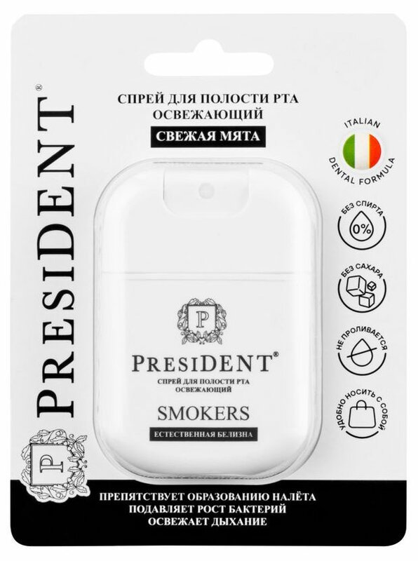 Спрей для полости рта освежающий President Smokers препятствует образованию налета, подавляет рост бактерий и освежает дыхание. Создан с использованием формулы, разработанной в Италии. Не содержит спирта и сахара.