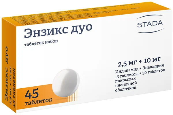 Энзикс дуо содержит два отдельных лекарственных средства в одной упаковке: диуретическое средство индапамид и ингибитор ангиотензинпревращающего фермента (AПФ) эналаприл. Индапамид. Гипотензивное средство, тиазидоподобный диуретик с умеренным по силе и длительным по продолжительности действием, производное бензамидов. Снижает тонус гладкой мускулатуры артерий, уменьшает общее периферическое сопротивление сосудов. Обладает умеренным салуретическим и диуретическим эффектами, которые связаны с блокадой реабсорбции ионов натрия, хлора, водорода, и в меньшей степени ионов калия в проксимальных канальцах и кортикальном сегменте дистального канальца нефрона. Сосудорасширяющие эффекты и снижение общего периферического сопротивления сосудов имеют в своей основе следующие механизмы: снижение реактивности сосудистой стенки к норадреналину и ангиотензину II; увеличение синтеза простагландинов, обладающих сосудорасширяющей активностью; угнетение тока кальция в гладкомышечные клетки сосудов. Способствует уменьшению гипертрофии левого желудочка сердца. В терапевтических дозах не влияет на липидный и углеводный обмен (в том числе у больных с сопутствующим сахарным диабетом). Антигипертензивный эффект развивается в конце первой/начале второй недели при постоянном приеме препарата и сохраняется в течение 24 часов на фоне однократного приема. Одновременное применение Энaлaприлa и Индапамида приводит к усилению антигипертензивного эффектa Энaлaприлa. Эналаприл. Антигипертензивный препарат, механизм его действия связан с уменьшением образования из ангиотензина I ангиотензина II, снижение содержания которого ведет к прямому уменьшению выделения альдостерона. При этом понижается общее периферическое сосудистое сопротивление, систолическое и диастолическое артериальное давление (АД), пост- и преднагрузка на миокард. Расширяет артерии в большей степени, чем вены, при этом рефлекторного повышения частоты сердечных сокращений не отмечается. Уменьшает деградацию брадикинина, увеличивает синтез простагландина. Гипотензивный эффект более выражен при высоком уровне ренина плазмы, чем при нормальном или сниженном его уровне. Снижение АД в терапевтических пределах не оказывает влияния на мозговое кровообращение, кровоток в сосудах мозга поддерживается на достаточном уровне и на фоне сниженного артериального давления. Усиливает коронарный и почечный кровоток. При длительном применении уменьшается гипертрофия левого желудочка миокарда и миоцитов стенок артерий резистентного типа, предотвращает прогрессирование сердечной недостаточности и замедляет развитие дилатации левого желудочка. Улучшает кровоснабжение ишемизированного миокарда. Снижает агрегацию тромбоцитов. Обладает некоторым диуретическим эффектом. Эналаприл является «пролекарством»: в результате его гидролиза образуется эналаприлат, который и ингибирует ангиотензинпревращающий фермент (АПФ). Время наступления гипотензивного эффекта при приеме внутрь — 1 час, он достигает максимума через 4-6 часов и сохраняется до 24 часов.