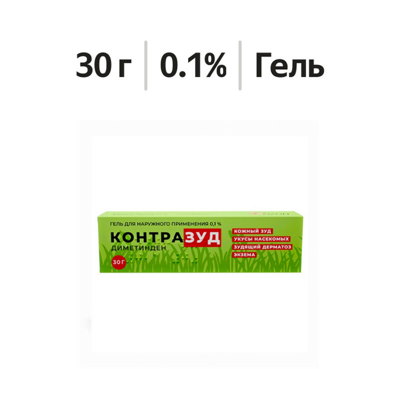 Диметиндена малеат 0.1 г. Вспомогательные вещества: пропиленгликоль - 15 г, карбомер - 0.9 г, натрия гидроксид - 0.3 г, динатрия эдетат - 0.05 г, бензалкония хлорид - 0.005 г, вода очищенная - до 100 г.
