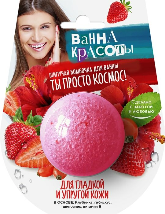 Шипучая бомбочка для ванны «Для гладкой и упругой кожи» – сладкий садовый десерт для кожи. Бомбочка бережно ухаживает за кожей, а волшебные ароматы переносят тебя в другое измерение. Клубника насыщает кожу витаминами и фруктовыми кислотами и придает тонус. Гибискус питает и увлажняет, а натуральный шиповник придает упругость. Витамин Е – главный витамин красоты, разглаживает кожу и делает ее невероятно нежной.