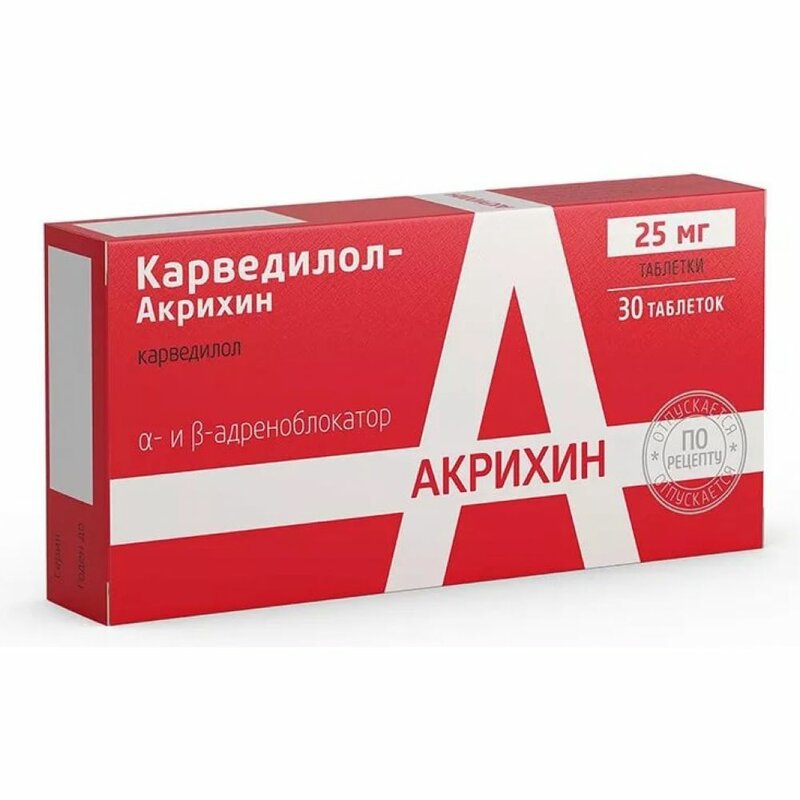 Внутрь независимо от приема пищи, запивая достаточным количеством жидкости. Артериальная гипертензия: рекомендованная начальная доза составляет 12.5 мг 1 раз в сутки в первые 2 дня проведения терапии, затем по 25 мг 1 раз в сутки. При необходимости в дальнейшем дозу можно увеличивать с интервалами не менее 2 недель, доводя до максимальной рекомендованной дозы 50 мг 1 раз в сутки (или разделенной на 2 приема). Ишемическая болезнь сердца Рекомендованная начальная доза составляет 12.5 мг 2 раза в сутки в первые 2 дня, затем по 25 мг 2 раза в сутки. При необходимости впоследствии дозу можно увеличивать с интервалами не менее 2 недель, доводя до высшей суточной дозы, равной 100 мг, разделенной на 2 приема. Хроническая сердечная недостаточность: дозу подбирают индивидуально, необходимо тщательное наблюдение врача. У пациентов, получающих сердечные гликозиды, диуретики и ингибиторы АПФ, следует скорректировать их дозы до начала лечения препаратом Карведилол-Акрихин. Рекомендованная начальная доза составляет 3.125 мг (1/2 таблетки по 6.25 мг) 2 раза в сутки в течение 2 недель. При хорошей переносимости дозу увеличивают с интервалами не менее 2 недель до 6.25 мг 2 раза в сутки, затем до 12.5 мг 2 раза в сутки, потом до 25 мг 2 раза в сутки. Дозу следует увеличивать до максимальной дозы, которая хорошо переносится пациентом. Рекомендованная максимальная доза – 25 мг 2 раза в сутки для всех пациентов с тяжелой хронической сердечной недостаточностью и для пациентов с легкой и умеренной степенью хронической сердечной недостаточности с массой тела пациента менее 85 кг. У пациентов с легкой и умеренной хронической сердечной недостаточностью и массой тела более 85 кг – рекомендованная максимальная доза составляет 50 мг 2 раза в сутки. Перед каждым увеличением дозы врач должен осмотреть пациента для выявления возможного нарастания симптомов хронической сердечной недостаточности или вазодилатации. При транзиторном нарастании симптомов хронической сердечной недостаточности или задержке жидкости в организме следует увеличить дозу диуретиков, в некоторых случаях приходится уменьшить дозу препарата Карведилол-Акрихин или временно отменить его. Симптомы вазодилатации можно устранить уменьшением дозы диуретиков. Если симптомы сохраняются, можно снизить дозу ингибитора АПФ (если пациент его принимает), а затем, при необходимости – дозу препарата Карведилол-Акрихин. В такой ситуации дозу препарата Карведилол-Акрихин не следует увеличивать, пока симптомы усиливающейся хронической сердечной недостаточности или артериальной гипотензии не улучшатся. Если лечение препаратом Карведилол-Акрихин прерывают более чем на 1 неделю, то его назначение возобновляют в меньшей дозе, а затем увеличивают в соответствии с приведенными выше рекомендациями. Если лечение препаратом Карведилол-Акрихин прерывают более чем на 2 недели, то его назначение следует возобновлять в дозе 3.125 мг (1/2 таблетки по 6.25 мг) 2 раза в сутки, затем подбирают дозу в соответствии с приведенными выше рекомендациями.