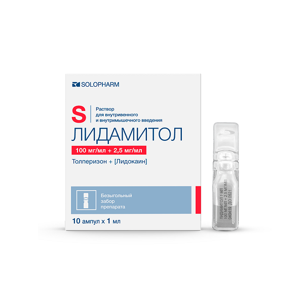 1 ампула содержит: толперизона гидрохлорид 100 мг, лидокаина гидрохлорида моногидрат (в пересчете на лидокаина гидрохлорид) 2.5 мг. Вспомогательные вещества: метилпарагидроксибензоат - 0.6 мг, пропиленгликоль - 0.3 мл, 0.1М раствор хлористоводородной кислоты - до pH 3.0-4.5, вода д/и - до 1 мл.