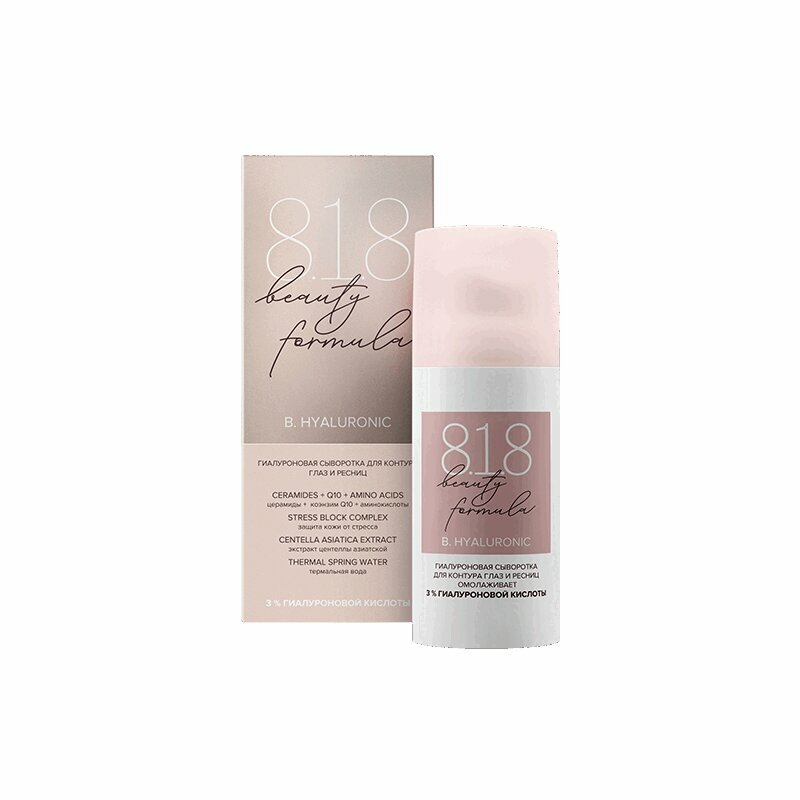 8.1.8 Beauty formula - трехфазная система профилактики и защиты кожи от стресса. Восстанавливает эпидермальный ресурс. Омолаживает кожу. Создана для чувствительной кожи женщин мегаполиса, испытывающих дефицит сна и отдыха. Гиалуроновая сыворотка для глаз и ресниц оказывает мгновенное видимое омоложение кожи вокруг глаз. Обладает эффектом лифтинга, способствует сокращению морщин, а также восстановлению и укреплению ресниц. Защищает кожу от стресса. Обладает мгновенным и пролонгированным омолаживающим действием. Активно действующие компоненты: гиалуроновая кислота (низко, средне-и высокомолекулярная) в концентрации 3% уникальный Stress Block Complex, комплекс витаминов А, Е, С, антиоксиданты растительного и синтетического происхождения (Q10, сафлоровое масло), аминокислоты, церамиды, экстракт центеллы азиатской. Минерализующая вода из термального источника на юге Франции восстанавливает и успокаивает кожу.8.1.8 beauty formula сохраняет естественную красоту кожи. Активные компоненты: 3 вида гиалуроновой кислоты, церамиды, коэнзим Q10, аминокислоты, экстракт виноградных косточек, экстракт центеллы азиатской, Stress Block Complex, витамин A, витамин С, витамин Е, соевое масло, сафлоровое масло, термальная вода.