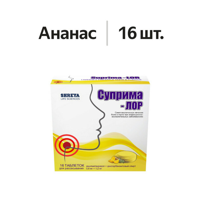 Активные вещества: дихлорбензиловый спирт -1,2 мг, амилметакрезол - 0,6 мг. Вспомогательные вещества: сахароза, декстроза, лимонная кислота, левоментол, краситель солнечный закат желтый (Е 110), краситель хинолиновый жёлтый (Е 104), ароматизатор ананасовый.