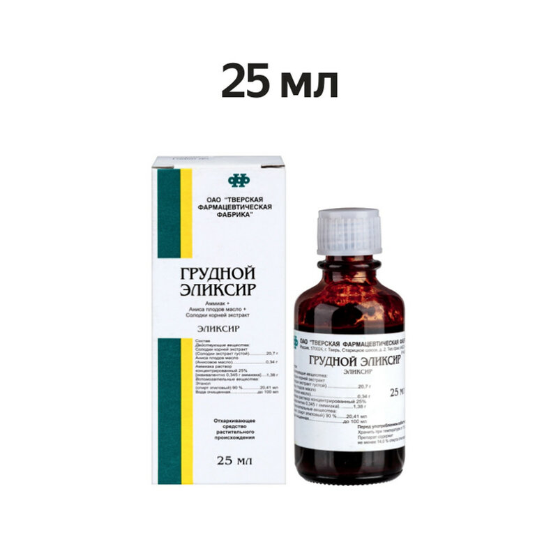 Отхаркивающий эффект грудного эликсира обусловлен действием входящих в него компонентов: солодки экстракт густой обладает противовоспалительным и отхаркивающим свойствами, которые связаны с содержанием в корнях глицирризина, стимулирующего активность реснитчатого эпителия в трахее и бронхах, а также усиливающего секреторную функцию слизистых оболочек верхних дыхательных путей; анисовое масло обладает отхаркивающим действием, обусловленным содержанием в масле анетола, который способствует рефлекторному возбуждению дыхания, повышению активности реснитчатого эпителия дыхательных путей и усилению секреции слизистых оболочек гортани, трахеи, бронхов; аммиак обладает раздражающим действием, которое приводит к возбуждению окончаний чувствительных нервов верхних дыхательных путей и рефлекторной стимуляции центра дыхания.