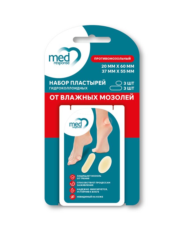 Набор пластырей гидроколлоидных Medresponse от влажных мозолей 20 х 60 мм и 37 х 55 мм 6 шт.