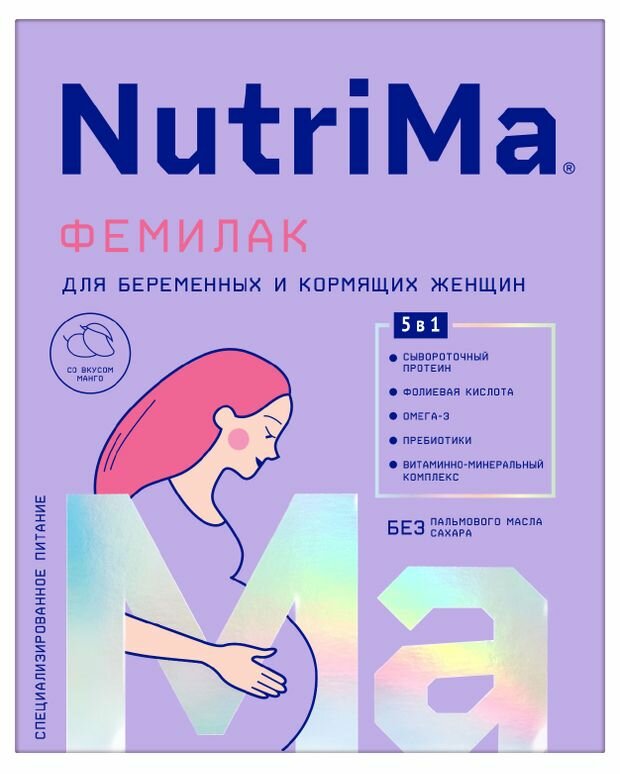 Nutrima фемилак для питания беременных и кормящих женщин со вкусом манго - сбалансированное дополнительное питание на молочной основе для беременных и кормящих женщин. Обеспечивает дополнительные потребности женщины в полноценном белке, фолиевой кислоте, омега - 3 жирных кислотах, кальции, железе, витаминах группы B и других нутриентах Положительно влияет на правильное формирование и развитие плода. В период кормления грудью: способствует улучшению качества грудного молока Обеспечивает организм женщины необходимыми пищевыми веществами и энергией. Помогает восстановиться женщине после родов.