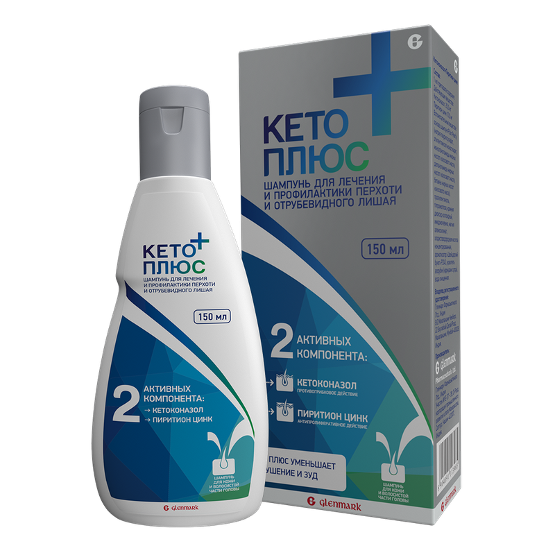 Кетоконазол - синтетическое производное имидазолдиоксалана, обладает противогрибковым действием в отношении дерматофитов, таких как Trichophyton spp., Epidermophyton spp., Microsporum spp. и дрожжеподобных грибов, таких как Candida spp. и Malassezia furfur (Pityrosporum ovale). Цинка пиритион обладает антипролиферативным действием на эпителиальные клетки и проявляет противогрибковую активность в отношении Pityrosporum ovale и Pityrosporum orbiculare, вызывающих избыточное шелушение кожи. Шампунь Кето плюс быстро уменьшает шелушение и зуд кожи головы, которые обычно ассоциируются с перхотью и себорейным дерматитом.