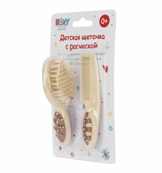 Расческа с натуральной щетиной и расческой-гребешком Roxy Kids позволит наиболее комфортно ухаживать за волосами и кожей головы малыша. C помощью расчески с частыми, но не острыми зубчиками удобно расчесывать запутавшиеся и скатавшиеся волосы, а с помощью натуральной щетки можно пригладить их и придать аккуратный вид. Комплект расчесок подойдет для массажа кожи головы и вычесывания себорейных корочек. Светлая корочка на голове у новорожденного – обычное явление, которое возникает из-за дисбаланса в работе сальных и потовых желез. Самый эффективный и безопасный способ избавления от себорейных корочек – аккуратное размягчение и вычесывание с помощью расчески. Специальные детские расчески Roxy Kids не травмируют нежную кожу и бережно воздействуют на мягкие ткани детской головки, стимулируя при этом рост новых волос. Малыш останется доволен, а родители смогут получить максимум радости от тактильного общения со своим малышом!