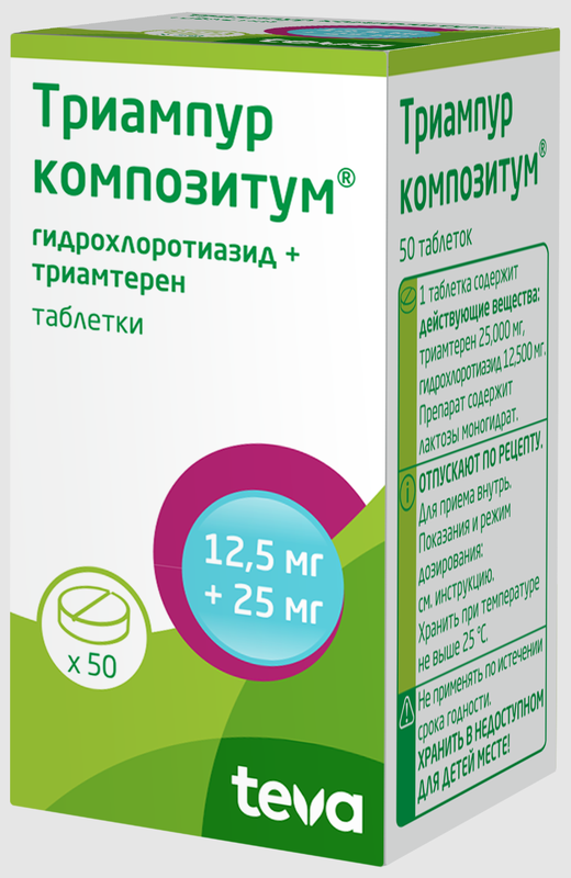 Комбинированное лекарственное средство. Оказывает диуретическое и гипотензивное действие. Гидрохлоротиазид - тиазидный диуретик, диуретический эффект, которого связан с нарушением реабсорбции ионов натрия, хлора, калия, магния и воды в дистальном отделе нефрона: задерживает выведение ионов кальция, мочевой кислоты. Обладает антигипертензивным действием, которое обусловлено расширением артериол. Не оказывает влияния на нормальное АД. Диуретический эффект проявляется через 1-2 ч и достигает максимума - через 4 ч, продолжительность действия в зависимости от дозы - 10-12 часов. Гипотензивное действие развивается через 3-4 дня, но для достижения оптимального терапевтического эффекта может потребоваться 3-4 недели. Триамтерен - калийсберегающий диуретик, уменьшает проницаемость клеточных мембран дистальных канальцев для ионов натрия и усиливает их выведение с мочой без увеличения выведения ионов калия. Секреция ионов калия в дистальных канальцах понижается. В комбинации с гидрохлортиазидом триамтерен способен уменьшать гипокалиемию, вызываемую тиазидными диуретиками и усиливать диуретический эффект гидрохлоротиазида. Диуретическое действие триамтерена после приема внутрь отмечается через 15-20 мин. Максимальный эффект - через 2-3 ч, длительность действия -12 ч.