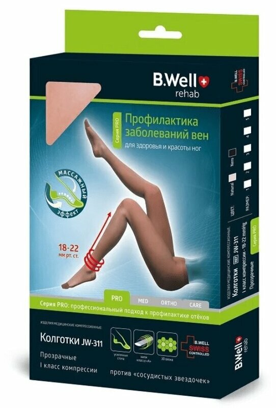 Колготки компрессионные B.Well rehab JW-311, I класс компрессии 18-22 мм рт. ст. для улучшения венозного оттока при начальных стадиях заболеваний вен. Механизм действия трикотажа основан на распределенном давлении: максимальное в области щиколотки 18-22 мм. рт.ст., уменьшается в области голени, в области бедра компрессия минимальна. Регулярное ношение компрессионного трикотажа: - Способствует улучшению кровотока; - Оказывает воздействие на поверхностные вены; - Способствует уменьшению отеков ног; - Снижает риск развития ХВН и проницаемость стенок сосудов. Современные технологии обеспечивают высокую эффективность, комфорт и элегантность компрессионного трикотажа B.Well rehab. 3D вязка - специальная вязка «объемными сотами» придает высокую прозрачность трикотажу и помогает сохранить естественный влаго- и теплообмен кожи. Нити класса «А» - комплексные нити с двойной S-образной оплёткой во встречных гарантируют изделиям эластичность и необходимый компрессионный эффект. Комфортные шортики – комфортные шортики с мягкой текстурой обеспечивают удобство при движении, а аккуратно вшитая ластовица гигиеничность и долговечность колготок. Массажный эффект - особое плетение на стопе обладает массажным эффектом, воздействует на нервные окончания и биоактивные точки подошвы стопы, уменьшает усталость и стимулирует кровообращение.Усиленная стопа - усиленная носочная и пяточная части плотно фиксируются на стопе и уменьшают риск случайных повреждений, плоские мягкие швы обеспечивают комфорт ношения.