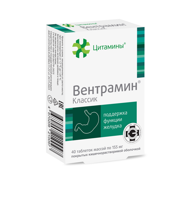 Вентрамин – биологически активная добавка к пище. Получен из слизистой оболочки желудка крупного рогатого скота и представляет собой комплекс белков и нуклеопротеидов, обладающих избирательным действием на клетки слизистой оболочки желудка, способствуя ускорению восстановления функций слизистой желудка - нормализует его моторику и ферментативную активность.