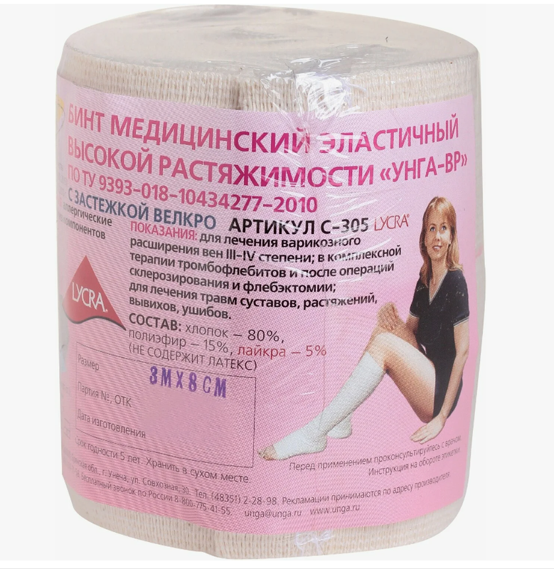 Унга-ВР бинт медицинский эластичный высокой растяжимости с застежкой 3 м х 8 см арт. С-305