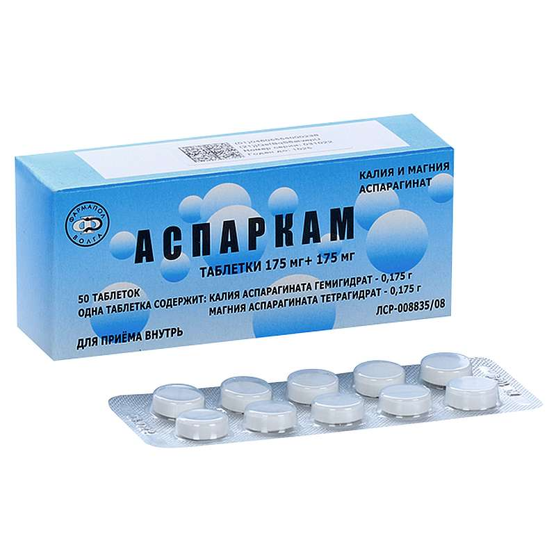 калия аспарагината гемигидрат - 0,175 г, магния аспарагината тетрагидрат - 0,175 г Вспомогательные вещества: крахмал кукурузный - 0,135 г, тальк - 0,010 г, кальция стеарат - 0,005 г.