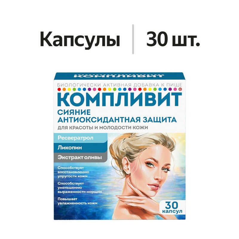 В состав БАД Компливит Сияние Антиоксидантная защита входят: Ресвератрол - полифенол, выделенный из экстракта красного вина (продукта переработки красного винограда). Является мощным антиоксидантом, борется с воздействием факторов старения на кожу и последствиями оксидативного стресса, помогая сохранить молодость кожи как можно дольше. Ресвератрол увеличивает продолжительность жизни клеток в экспериментальных моделях старения, замедляет процессы фотостарения кожи, уменьшает разрушение коллагена, эластина и гиалуроновой кислоты, что способствует повышению тонуса и эластичности кожи, уменьшению выраженности морщин. Ресвератрол помогает уменьшить интенсивность возрастных нарушений пигментации (пятен), что может способствовать выравниванию и осветлению тона кожи, улучшению цвета лица. Ресвератрол оказывает защитное действие на клетки кожи от воздействия негативных внешних факторов (неблагоприятная экология, курение, солнечное излучение, воздействие чужеродных веществ), провоцирующих увеличение образования агрессивных свободных радикалов и усиление оксидативного стресса. Ликопин - каротиноид, выделенный из красных томатов. Является одним из наиболее сильных антиоксидантов в ряду «диетических» каротиноидов. Дополнительное потребление ликопина может уменьшать оксидативный стресс и снижать риск повреждений эндотелия (внутренняя поверхность кровеносных сосудов) и нарушений функций кровеносных сосудов. Накапливаясь во всех слоях кожи, ликопин защищает клетки кожи от разрушающего действия ультрафиолетовых лучей, замедляет процессы фотостарения кожи и регулирует ее пигментацию. Экстракт оливы - содержит гидрокситирозол (полифенол, выделенный из плодов оливы), олеаноловую и аскорбиновую кислоту и флавоноиды (рутин, лютеин, гесперидин). Высокая антиоксидантная активность гидрокситирозола защищает клетки кожи от повреждения свободными радикалами и преждевременного старения (экспериментальные данные). Замедление процессов, связанных со старением кожи, обусловлено антиоксидантным действием компонентов экстракта, в особенности гидрокситирозола, который защищает клетки кожи от неблагоприятного влияния ультрафиолетовых лучей и факторов окружающей среды, обладает противовоспалительным действием. Ресвератрол, ликопин и гидрокситирозол являются естественными составляющими «средиземноморского стиля питания», способствуют замедлению процессов старения клеток кожи, помогают коже дольше оставаться здоровой и молодой.