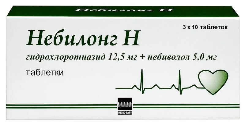 Небиволол. Частота побочных эффектов представлена в следующей градации: очень часто (более 10%), часто (более 1% и менее 10%), нечасто (более 0.1% и менее 1 %), редко (более 0.01% и менее 0.1%), очень редко (менее 0.01%), включая отдельные сообщения.Со стороны нервной системы: часто: головная боль, головокружение, повышенная утомляемость, слабость, парестезии; нечасто: депрессия, яркие сновидения, спутанность сознания, бессонница; очень редко: синкопе, галлюцинации, амнезия.Со стороны ЖКТ: часто: тошнота, запор, диарея; нечасто: метеоризм, диспепсия, рвота.Со стороны сердечно-сосудистой системы: нечасто: брадикардия, сердечная недостаточность, AV-блокада, ортостатическая гипотензия, нарушения периферического кровообращения (ощущение "холода" в конечностях, цианоз), одышка, нарушения ритма сердца, синдром Рейно, периферические отеки, кардиалгия, усугубление течения хронической сердечной недостаточности, выраженное снижение АД.Со стороны кожных покровов: нечасто: кожная сыпь эритематозного характера, кожный зуд, гиперемия кожных покровов; очень редко: усугубление течения псориаза, алопеция; в отдельных случаях: ангионевротический отек.Со стороны дыхательной системы: нечасто: бронхоспазм (в т.ч. при отсутствии обструктивных заболеваний легких в анамнезе), бронхоспазм у пациентов с бронхиальной астмой или обструкцией дыхательных путей в анамнезе.Прочие: фотодерматоз, гипергидроз, нарушения зрения (сухость глаз), сексуальная дисфункция.ГидрохлортиазидНарушение водно-электролитного баланса:гипокалиемия, гипонатриемия, гиперкальциемия и гипохлоремический алкалоз: сухость слизистой оболочки полости рта, чувство жажды, нерегулярный ритм сердца, лабильность настроения или психики, судороги и боли в мышцах, тошнота, рвота, необычная усталость или слабость. Гипохлоремический алкалоз может вызвать печеночную энцефалопатию или печеночную кому;гипонатриемия: спутанность сознания, судороги, замедление процесса мышления, повышенная утомляемость, повышенная возбудимость, конвульсии, летаргия.Метаболические явления: гипергликемия, глюкозурия, гиперурикемии с обострением подагры.Лечение тиазидами может снижать толерантность к глюкозе и латентно протекающий сахарный диабет может манифестироваться. При применении высоких доз могут повышаться концентрации липидов в сыворотке крови.Со стороны пищеварительного тракта: холецистит или панкреатит, холестатическая желтуха, диарея, сиаладенит, запор, анорексия.Со стороны сердечно-сосудистой системы: аритмии, ортостатическая гипотензия, васкулит.Со стороны нервной системы: головокружение, временно расплывчатое зрение, головная боль, парестезии.Со стороны органов кроветворения: очень редко: лейкопения, агранулоцитоз, тромбоцитопения, гемолитическая анемия, апластическая анемия.Аллергические реакции: крапивница, пурпура, некротический васкулит, синдром Стивенса-Джонсона, респираторный дистресс-синдром (включая пневмонит и некардиогенный отек легкого), фоточувствительность, анафилактические реакции вплоть до шока.Прочие: снижение потенции, нарушение почечной функции, интерстициальный нефрит.
