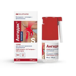 Ангидак интенсив спрей для горла 0.255 мг/доза + 0.17 мг/доза + 0.85 мг/доза 176 доз 30 мл